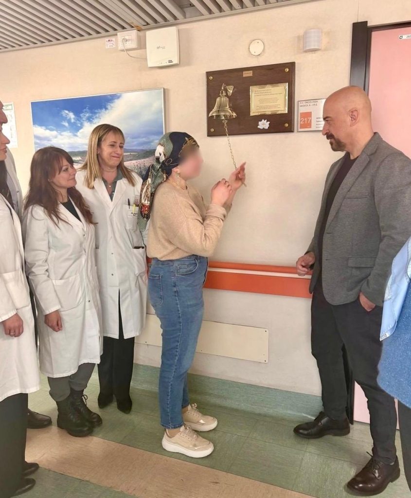 A inaugurarla è stata una paziente giovanissima che ha voluto donarla al reparto, al termine dell’ultima infusione. Visibilmente commossa, ha fatto risuonare la campana prima delle dimissioni. Tre rintocchi. Non uno soltanto. Tre, come indicato sulla targa che accompagna la campana: il primo per ciò che ha attraversato, il secondo per celebrare il presente, il terzo come augurio di un futuro radioso.