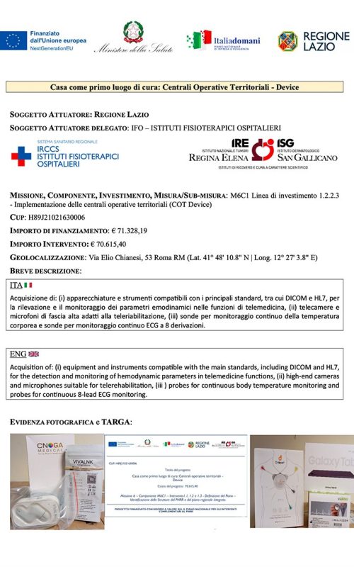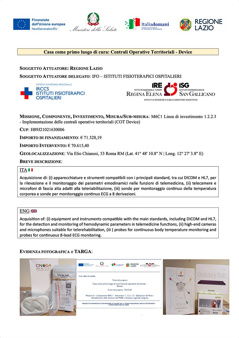 Menu di pagina Progetti PNRRM6C2 Intervento 1.1.2 – Grandi Apparecchiature e M6C1 Intervento1.2.2 – COT AngiografoECO CardioECO CardioECO GinecologicoLinac 1Linac 2Linac 3MammografiaPETRMTLCSPECT CTCOT DeviceCOT InterconnessioneCOT LavoriECOTOMOGRAFO MULTIDISCIPLINARE 1ECOTOMOGRAFO MULTIDISCIPLINARE 2ECOTOMOGRAFO MULTIDISCIPLINARE 3 Progetti PNRR / M6C2 Intervento 1.1.2 – Grandi Apparecchiature e M6C1 Intervento1.2.2 – COT / COT DeviceChi Siamo Istituti Fisioterapici Ospitalieri Mission e Storia IFO Organizzazione Aziendale Carta dei servizi Accreditamenti Istituto Nazionale Tumori “Regina Elena” Mission e Storia IRE Dipartimento Clinica e Ricerca Oncologica Dipartimento Ricerca e Tecnologie Avanzate Istituto dermatologico “San Gallicano” Mission e Storia ISG Dipartimento Clinica e Ricerca Dermatologica Parco Tecnologico dell’ISG 300 anni ISG MENU DI PAGINACOT Devicescarica la versione pdf