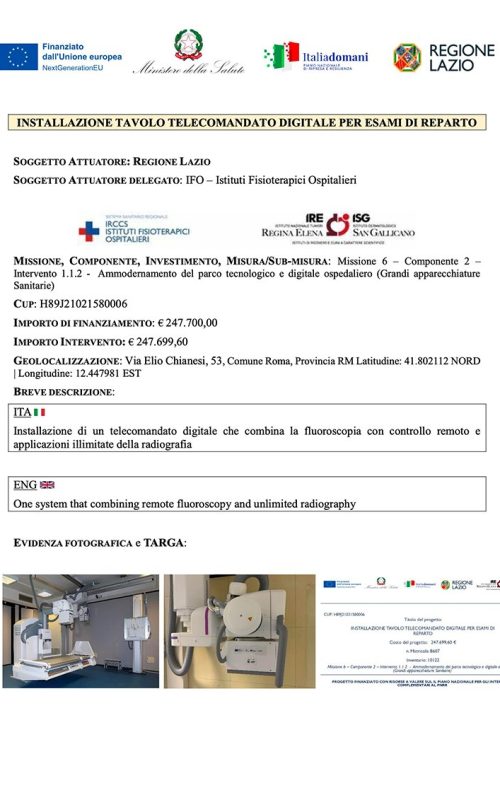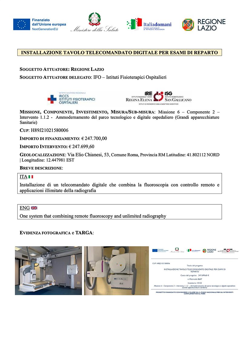 Menu di pagina Progetti PNRRM6C2 Intervento 1.1.2 – Grandi Apparecchiature e M6C1 Intervento1.2.2 – COT AngiografoECO CardioECO CardioECO GinecologicoLinac 1Linac 2Linac 3MammografiaPETRMTLCSPECT CTCOT DeviceCOT InterconnessioneCOT LavoriECOTOMOGRAFO MULTIDISCIPLINARE 1ECOTOMOGRAFO MULTIDISCIPLINARE 2ECOTOMOGRAFO MULTIDISCIPLINARE 3 Progetti PNRR / M6C2 Intervento 1.1.2 – Grandi Apparecchiature e M6C1 Intervento1.2.2 – COT / TLCChi Siamo Istituti Fisioterapici Ospitalieri Mission e Storia IFO Organizzazione Aziendale Carta dei servizi Accreditamenti Istituto Nazionale Tumori “Regina Elena” Mission e Storia IRE Dipartimento Clinica e Ricerca Oncologica Dipartimento Ricerca e Tecnologie Avanzate Istituto dermatologico “San Gallicano” Mission e Storia ISG Dipartimento Clinica e Ricerca Dermatologica Parco Tecnologico dell’ISG 300 anni ISG MENU DI PAGINATLCscarica la versione pdf