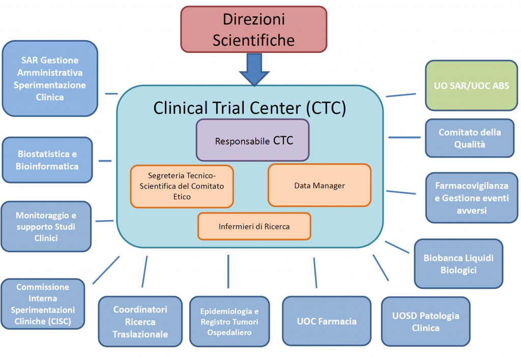 Il CTC dispone, oltre che di personale, anche di uno spazio fisico adeguato che permette nell’insieme di centralizzare la gestione dei data manager (sotto coordinamento del Responsabile del CTC), di ospitare gli infermieri di ricerca, di gestire audits/monitoraggi degli studi clinici con le Ditte Farmaceutiche/Promotori/CRO o con le Agenzie Regolatorie. Inoltre il CTC dispone, attraverso le quote derivanti dalla ripartizione dei fondi provenienti dalle sperimentazioni cliniche, di adeguate risorse finanziarie che possono essere utilizzate anche per il continuo aggiornamento professionale.